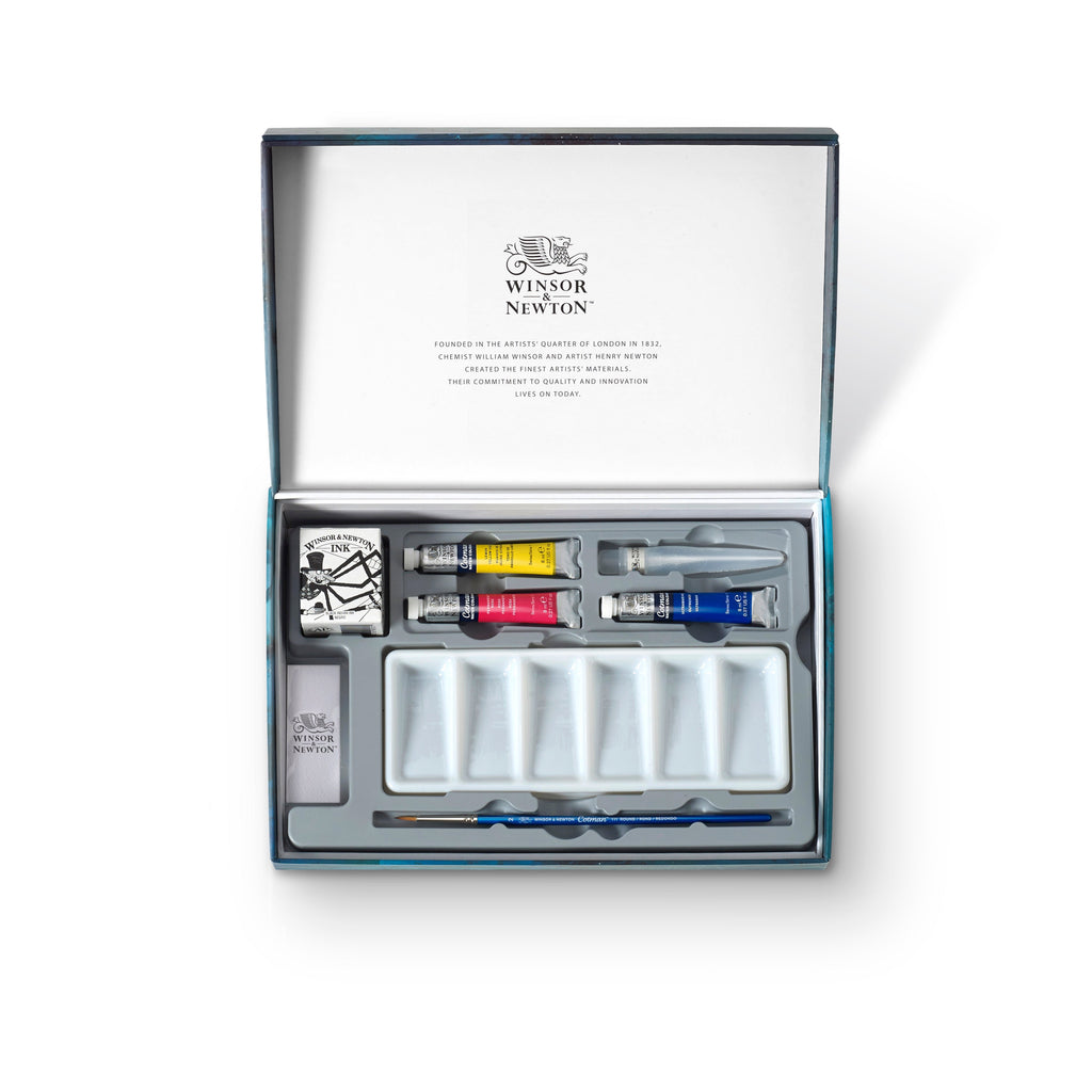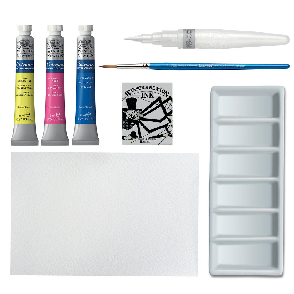 Contiene 6 tarjetas postales de papel, 3 tubos de 8ml de acuarela Cotman (amarillo limón, rosa permanente y azul ultramar), 1 tinta de dibujo de 14ml (negro), 1 pincel redondo sintético #2, 1 pincel waterbrush y 1 mezcladora.