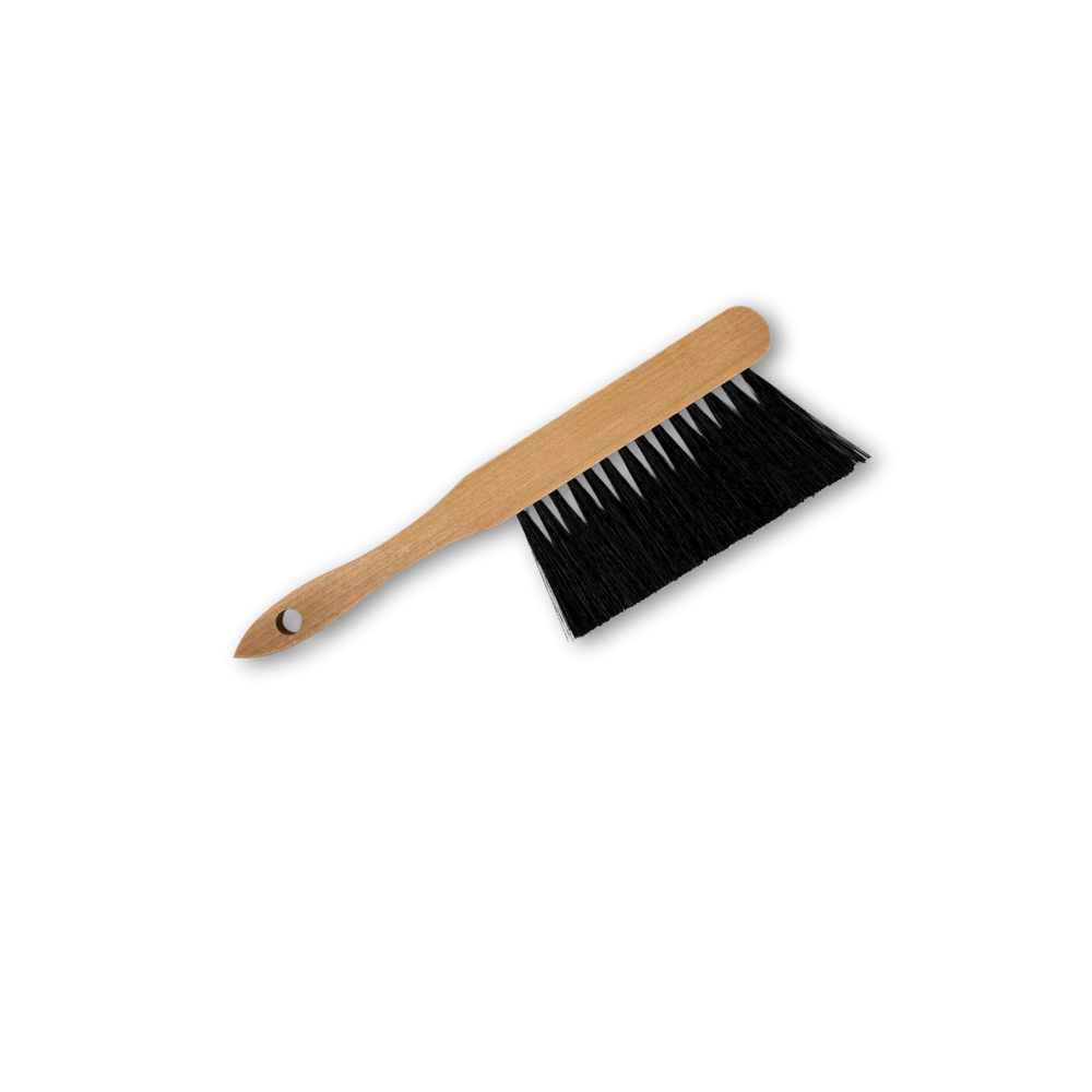 Cepillo con mango de madera y cerdas suaves.