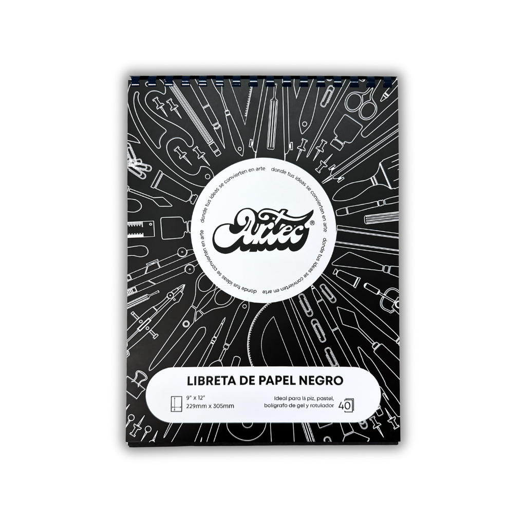 Libreta de dibujo con papel negro ideal para realizar dibujos en blanco, tonos metálicos y pasteles. El papel negro realza los contrastes de los dibujos de colores.